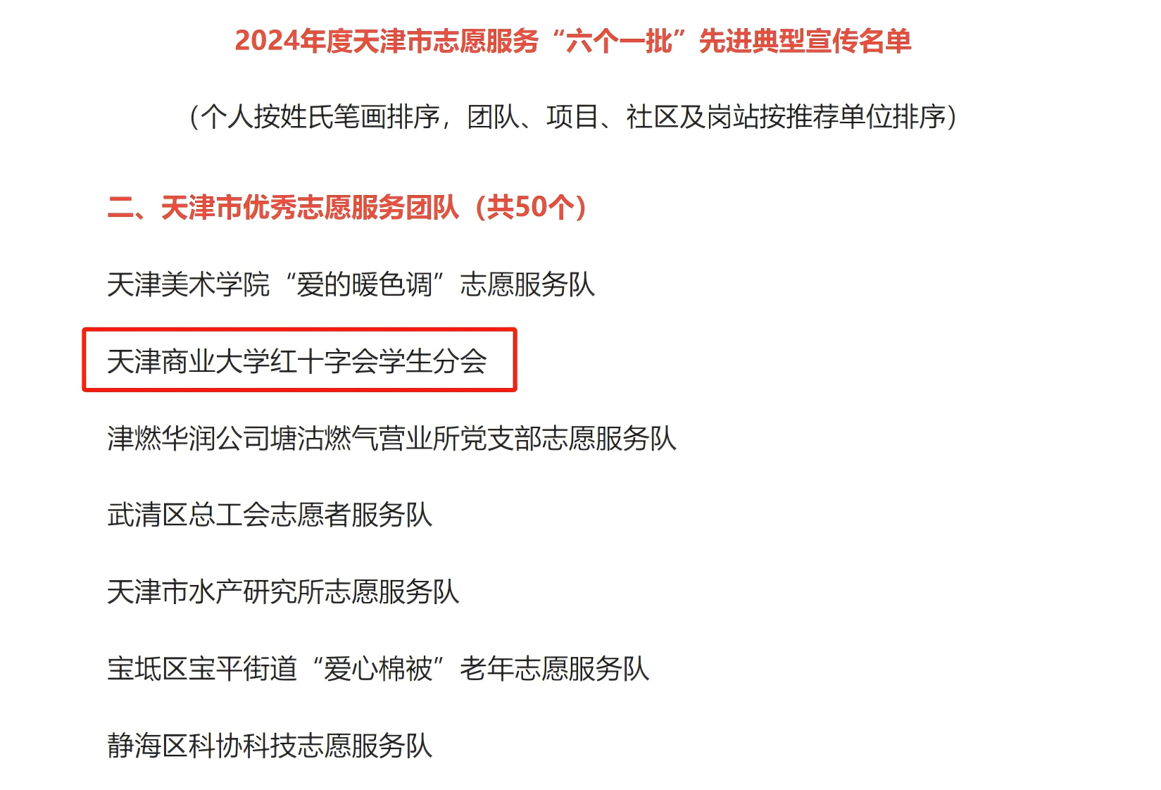 近日,2024年度天津市志愿服务“六个一批”先进典型名单公布,我校红十字会学生分会获评“天津市优秀志愿服务团队”荣誉称号。