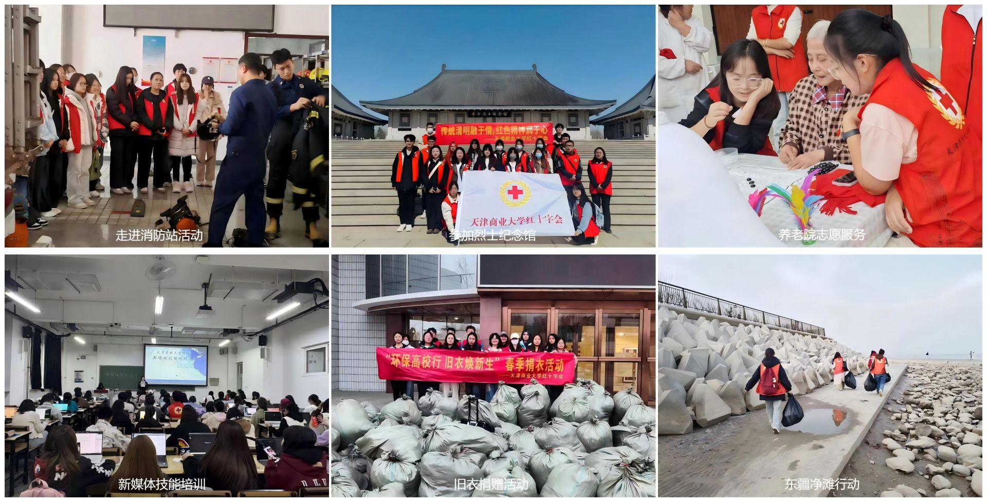 天津商业大学红十字会成立于1987年,其学生分会是校团委直属大型公益服务型学生组织,下设健康促进部、急救培训部、同伴教育部等7个部门及11个学院分会,现有注册会员530人,面向学校2.3万余名学生开展防艾宣传、无偿献血、急救培训、传染病防治宣传、助老助残、生态保护、体质测试等志愿服务工作。37年来,校红十字会发展会员1.3万余人,志愿服务时长累计超过20万小时。校红会不断加强自助助人能力培养,建立“专业师资--学生讲师--学生群体”和“知识普及+综合能力+新媒体技能”多层次培训活动体系,提高志愿服务效果和影响力。小红豆们在校园内外、线下线上齐力开展无偿献血志愿活动和防艾大讲堂、创意“艾”集等防艾科普活动;走进消防站学习消防安全知识,开展心肺复苏、止血包扎等急救培训,助力安全校园建设;走进社区、敬老院,给老人带去温暖与陪伴;开展旧衣回收、东疆港净滩行动等,助力生态保护。学生们用青春热情爱心接力,情暖社会,用行动诠释红十字精神。